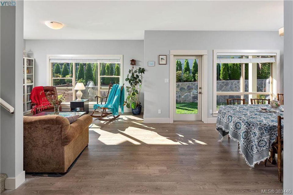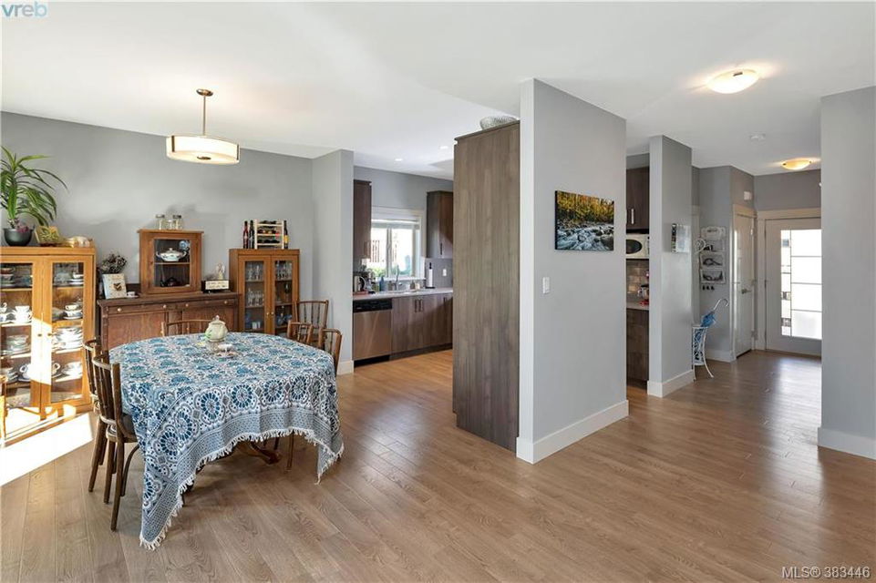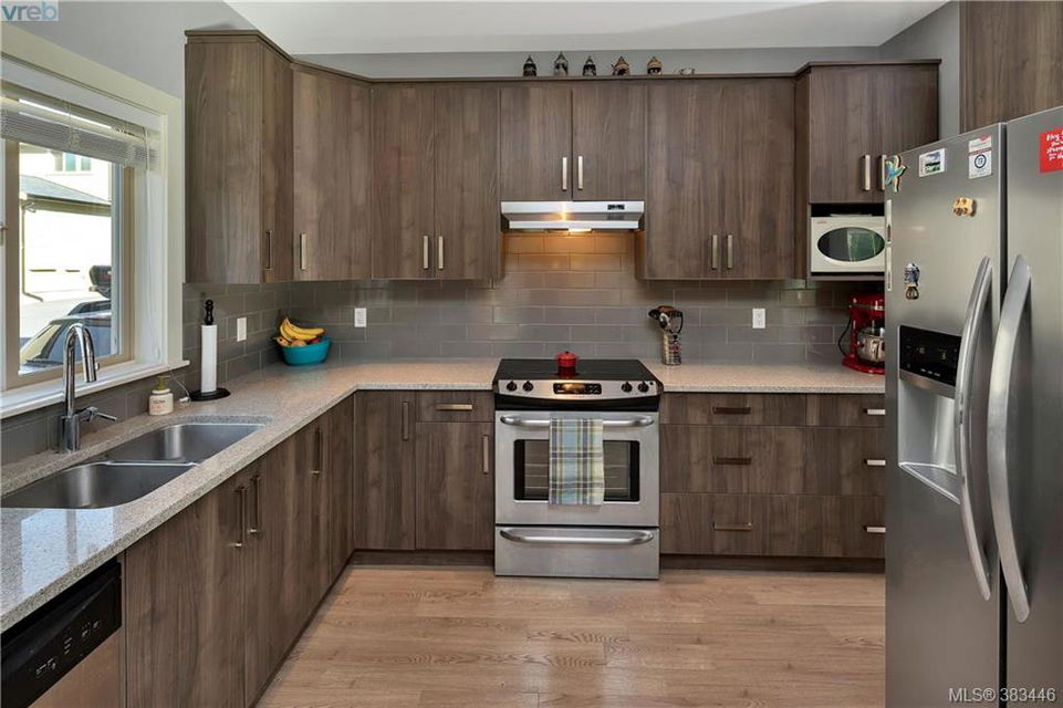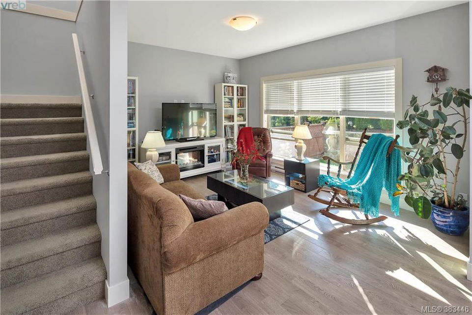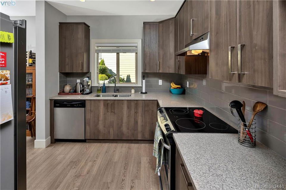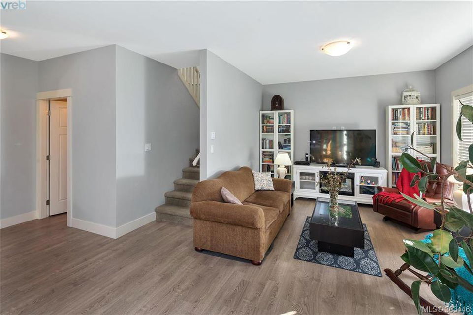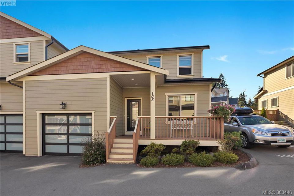 NEW PRICE Beautiful 2015 built, 1710 sq. ft. 3 bed+Den, 3 bath townhouse located in the heart of Sooke in the sought after ‘Townsend Park’ complex. Laminate floors, kitchen with quartz counters, high-end appliances and window blinds. Glass paneled garage door, glass front door, over-sized windows throughout, contemporary upscale finishing details, and 9ft ceilings give the home a modern and flexible living experience. Unit has covered front porch and a rear patio perfect for the BBQ. This home has a fenced yard and the complex backs on to the municipal trail system just a short walk to schools and the town core. The main floor has excellent flow between the kitchen, eating and living/den areas and the upstairs has the 3 large bedrooms, two full baths. Master is sure to please with 5 piece ensuite inc soaker tub, separate shower and a walk-in closet. Low monthly strata fees, pets and families welcome. Check out the 3D tour.