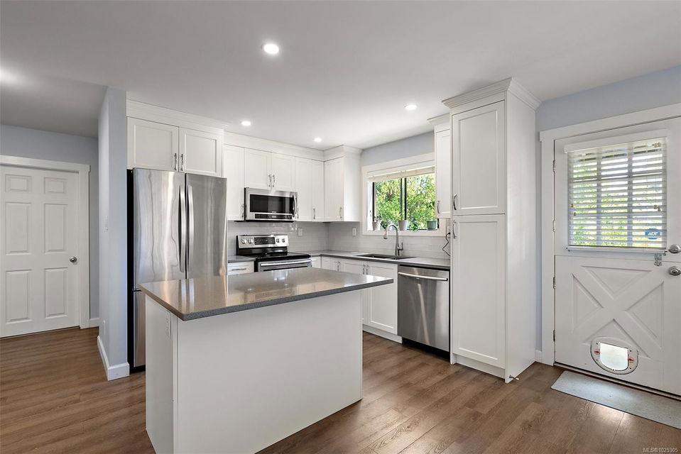 Beautifully maintained home in one of View Royal’s most connected & convenient neighbourhoods with income potential! This 5-bed, 3-bath property offers a versatile layout featuring a spacious main-level living area & a self-contained suite below. The main floor showcases a tastefully updated kitchen complete w/ stainless steel appliances & a functional eat-in island, flowing into a bright & comfortable living space w/ 3 beds, 2 baths, lower kitchenette + flex space. The lower level also includes a 2-bed suite with its own separate entrance—ideal for extended family, added income, or multi-generational living quarters. The lot itself is a true standout—flat, sunny, & private w/ lovely curb appeal, welcoming front porch, & mature privacy hedging. Tucked on a quiet street, yet just steps from the Rail Trail, View Royal Park, Portage Inlet, & Admirals Walk Shopping, this is a rare opportunity to enjoy flexible living in a family-friendly neighborhood with everything at your fingertips.