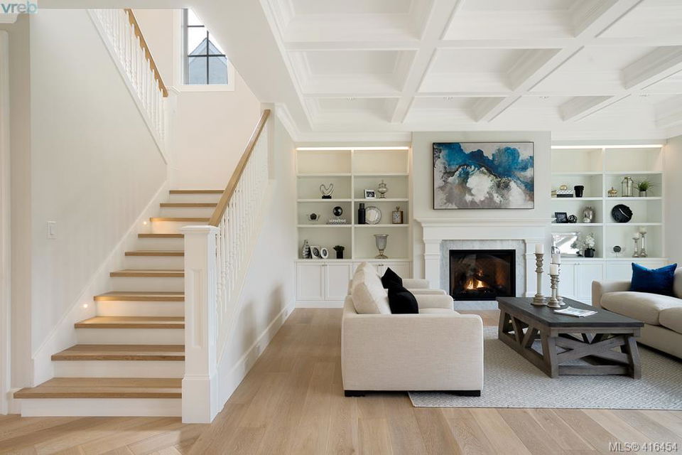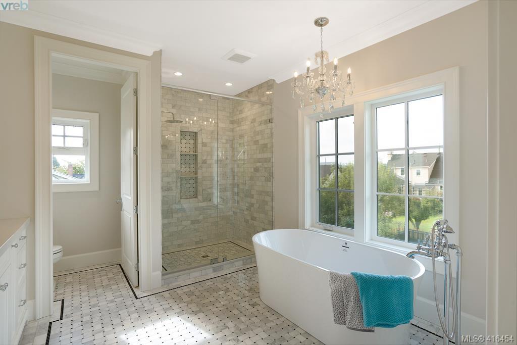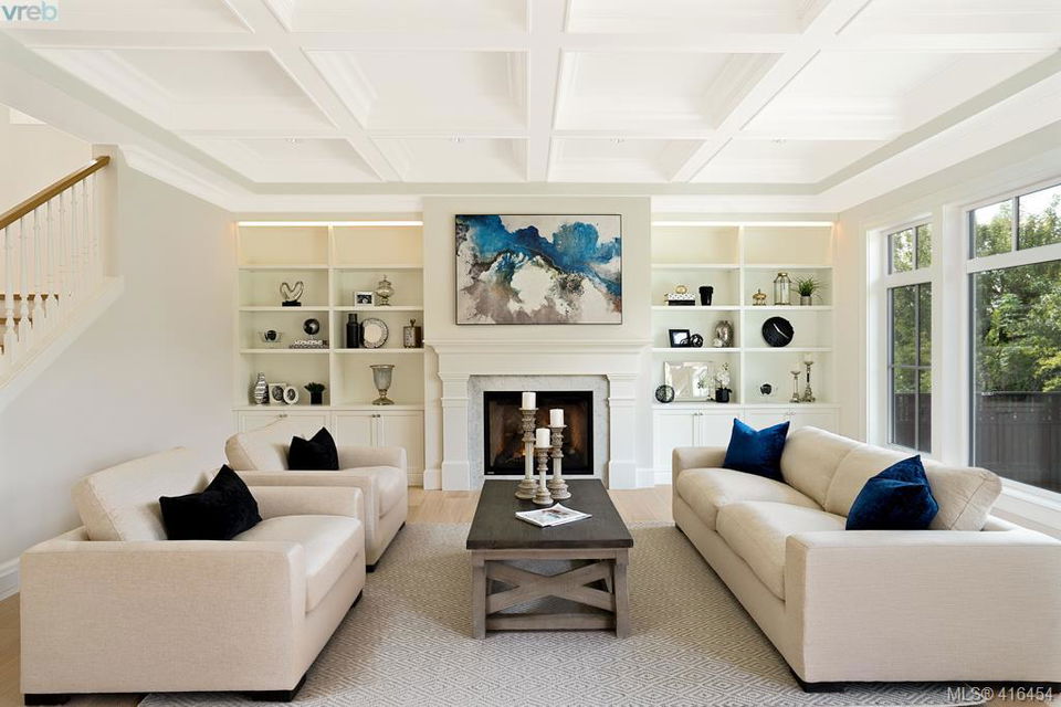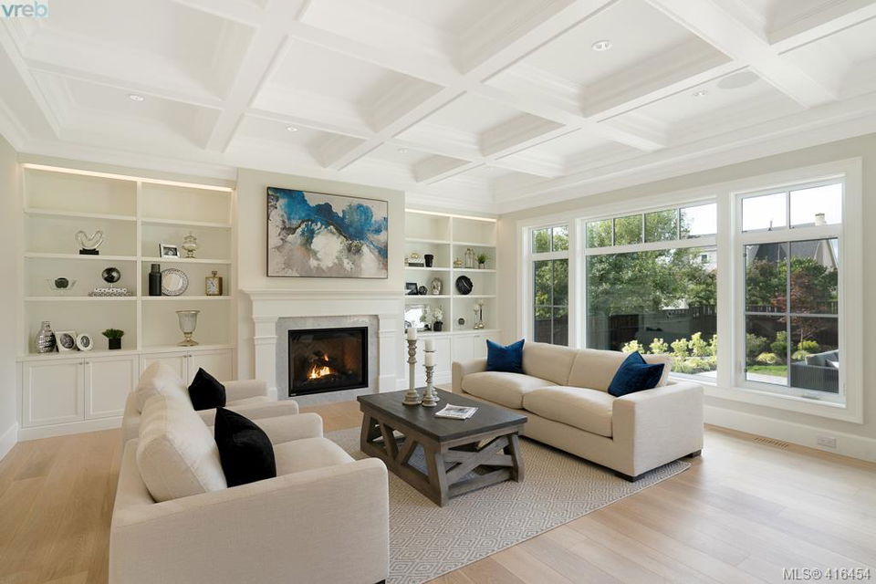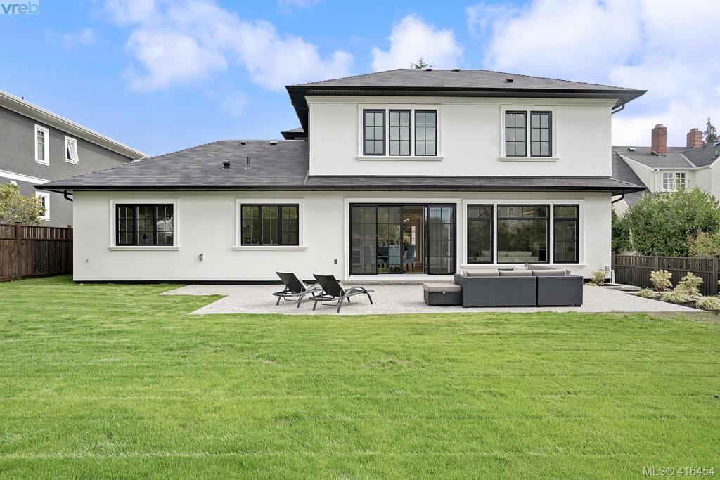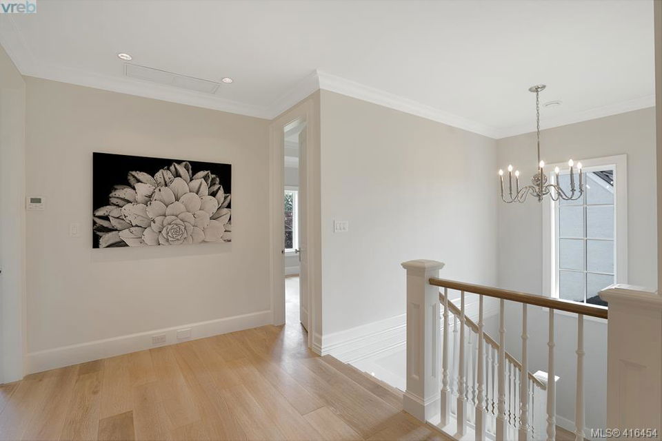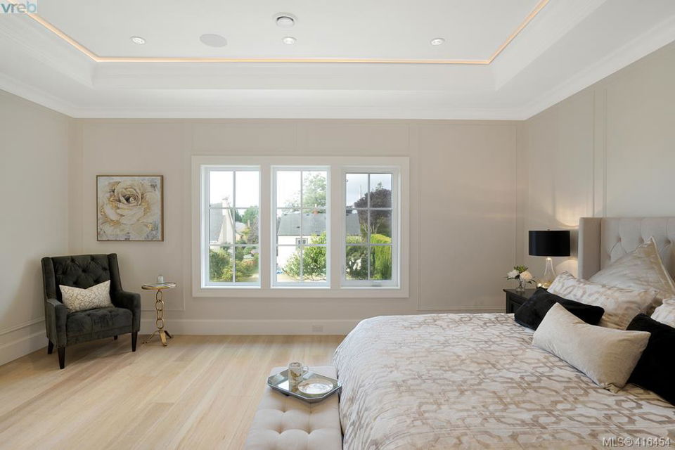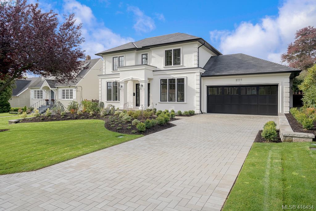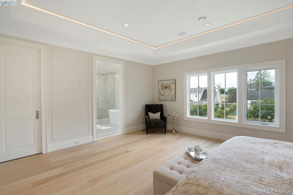 This exceptional newly built home is situated in the one of the most desirable neighbourhoods of Victoria. Custom designed throughout with outstanding finishing and superior attention to detail with 10ft ceilings on two of the three levels, 5 bdrms, an office and 6 baths elegantly assembled over 4779 sq ft. The light Oak flooring weaves its way throughout the home. Two heat-pumps ensure all season comfort. The Butlers pantry has a second dishwasher and connects the dining room and the kitchen. Floor to ceiling windows overlooking the SE facing fenced backyard bring in warm light that accentuates the coffered ceilings and triple-step crown moulding. Upper level has laundry, 3 bdrms and 3 bth with heated marble tile flrs. The magnificent ensuite bathroom has the ultimate in relaxation; deep soaker tub and walk in marble shower. The lower level has 9ft ceilings with a dazzling Entertainment room with wet bar, two more bdrms and two 5 piece bathrooms. Wait till you see the appliances!!