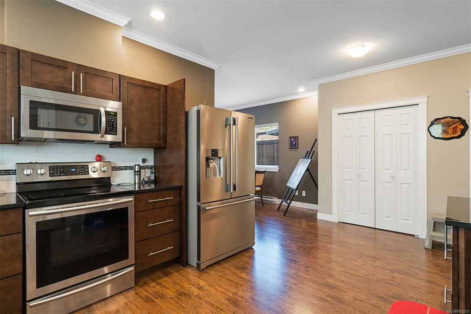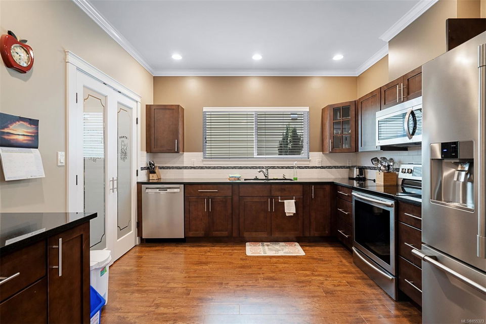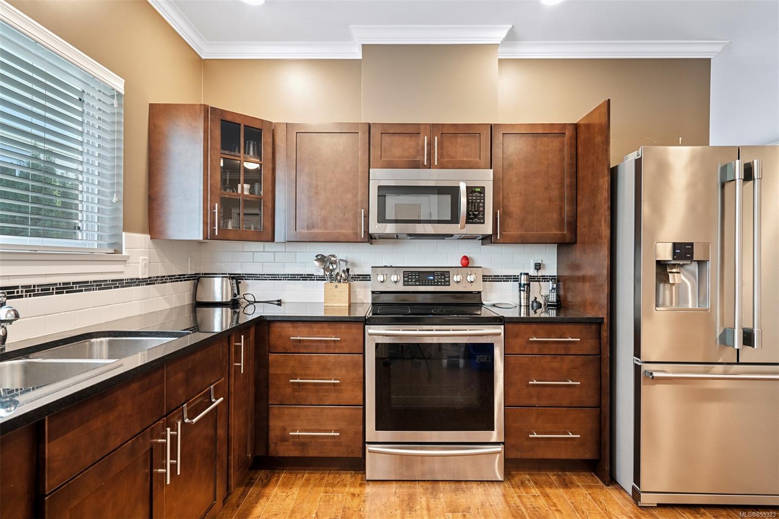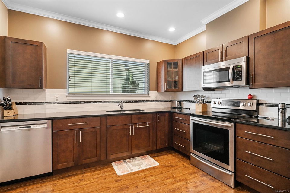 Welcome to Hazelwood Crossing where your desired family home sits without breaking the budget, all while delivering luxury finishes & quality throughout. This 3 bed 3 bath offers a main level ideal for entertaining with open concept living/dining/kitchen, 2 pce guest bathroom, & detailed crown moulding throughout. The kitchen is finished with unique frosted glass double pantry, wood faced cabinets, soft closing storage drawers, & granite countertops. The living room is an inviting space with electric wall fireplace & easy access out to the patio w. fully fenced yard. Upstairs welcomes 9 ft. ceilings, 3 large bedrooms, full 4 pce bath, & 4 pce ensuite. Situated just a block away from the Luxton fair grounds, Happy Valley Elementary School, & directly across from the Galloping Goose Trail. From the attached garage, detached storage, family neighbourhood, & underground sprinkler system – this home truly has it all!