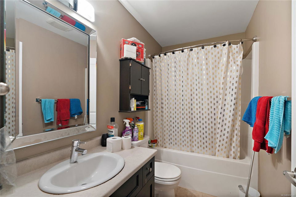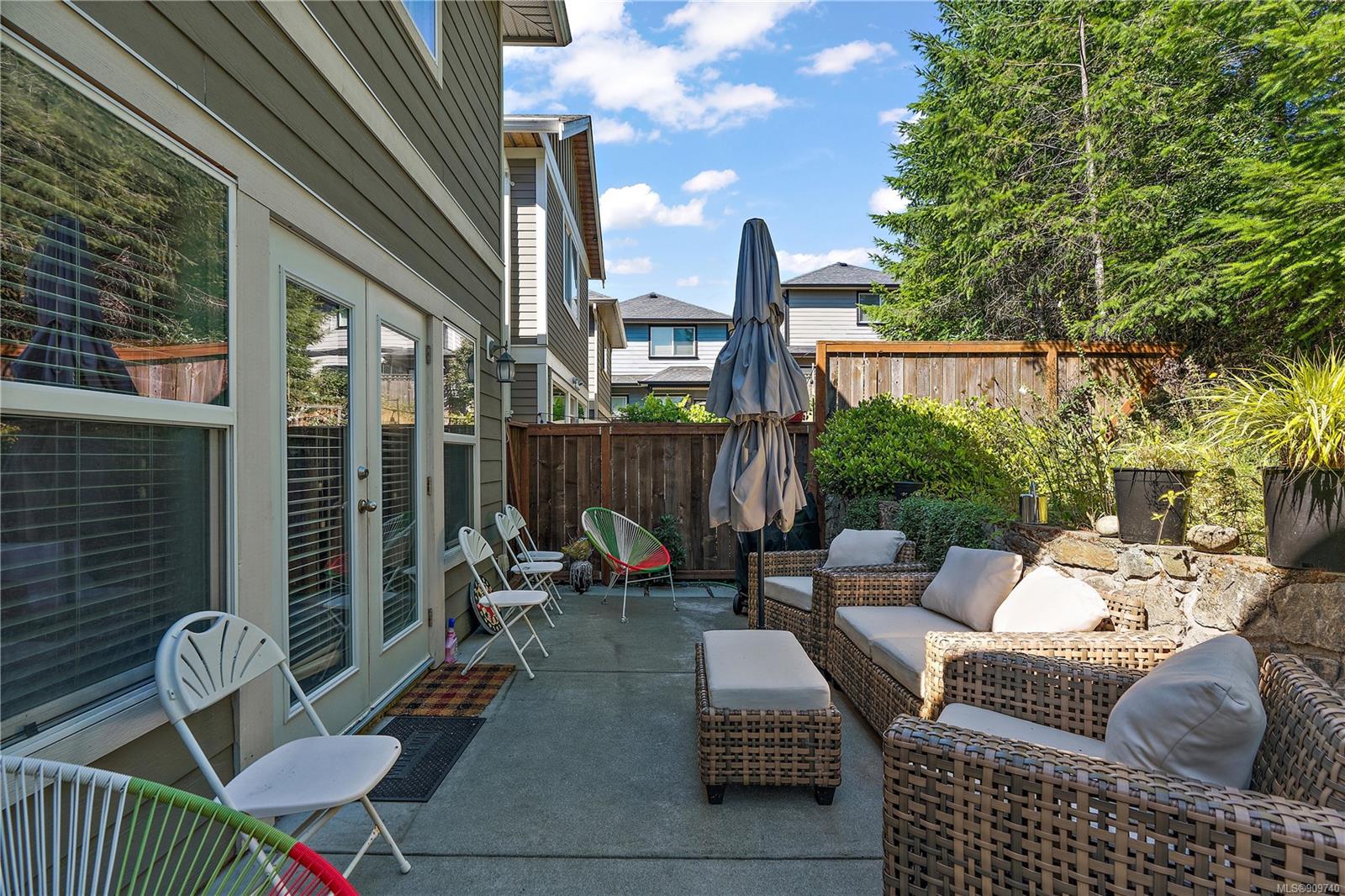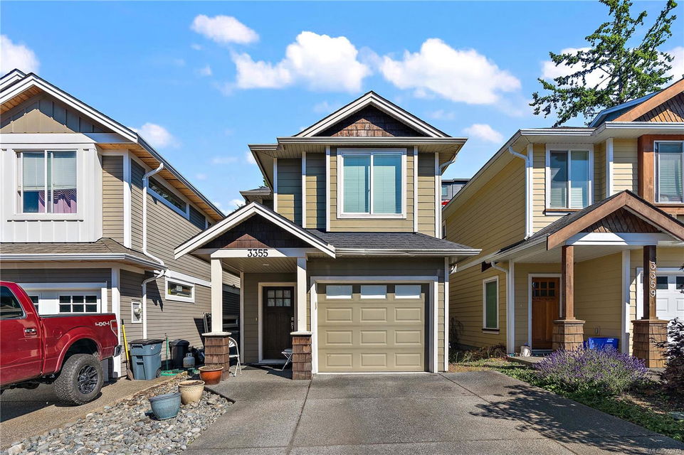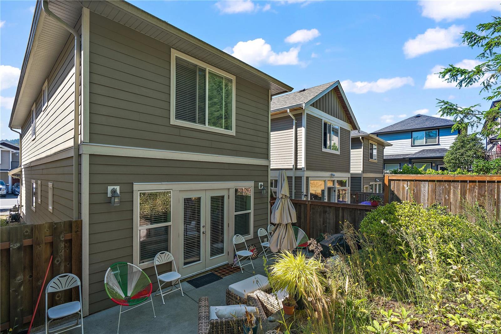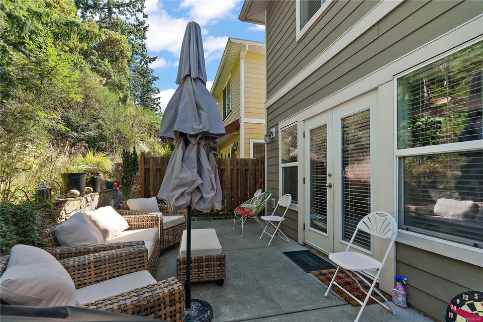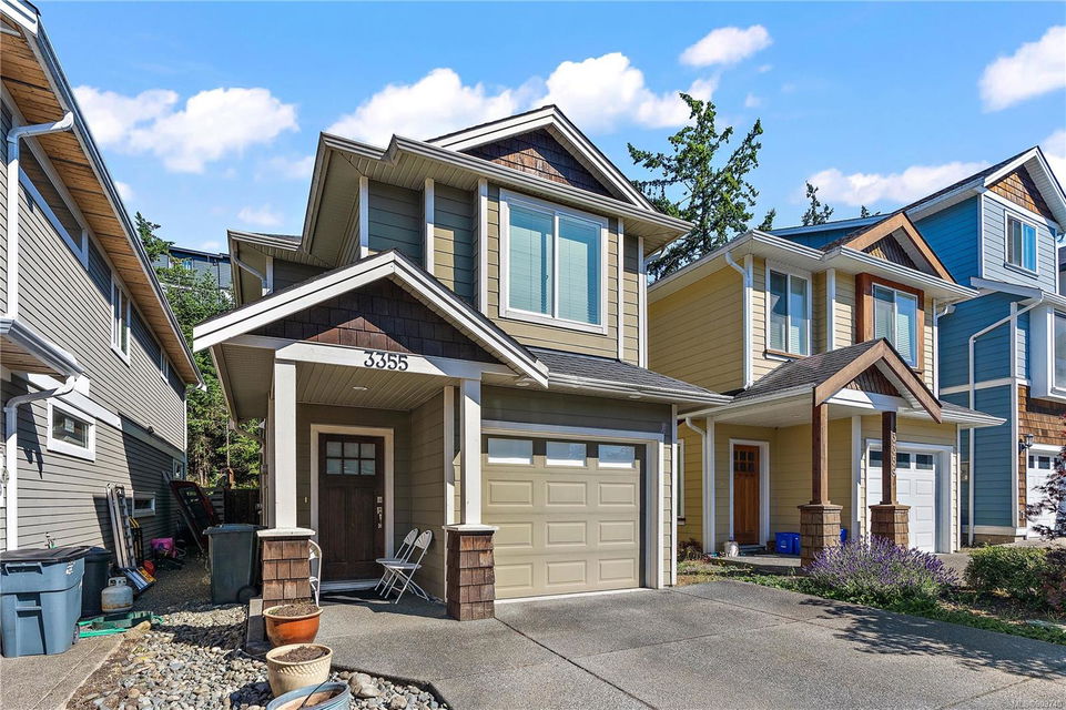 This delightful 3 bed, 3 bath single-family home is a great alternative to a townhouse with a superior floor plan offering two stories, 1,404 sq. ft. of living space, attached garage, fresh paint, w/ recently replaced carpets & brand-new washer dryer combo. The main level features hard surfaced flooring, 2-pce bath, w/ central kitchen, sparkling granite countertops, eat in island, stainless appliance pkg, which perfectly extends to the dining area to 16×11 large living room with gas fireplace & French doors out to the patio. Upstairs you will find a generously sized primary bedroom w/ double closets and premium 4-pce ensuite w/ relaxing soaker tub. With 2 additional bedrooms & 4-pce bath, this home is perfect for a small family or starter. Happy Valley is a fantastic area to put down your roots – walking distance to Happy Valley Elementary, the stunning mountain views from Happy Hill, or just a quick drive over to the new Belmont Market and Westshore Town Centre.