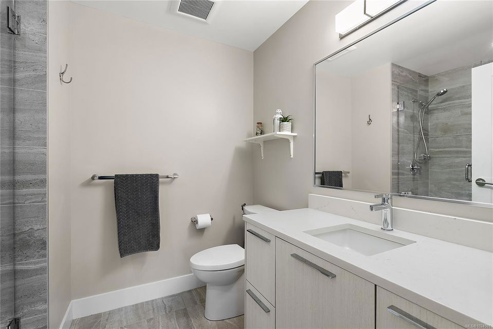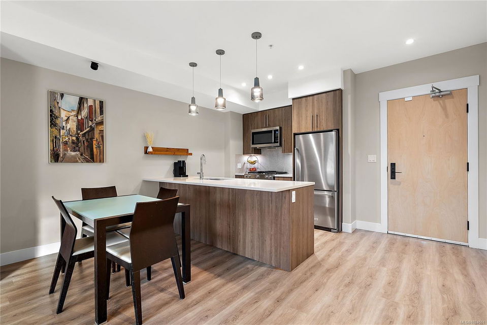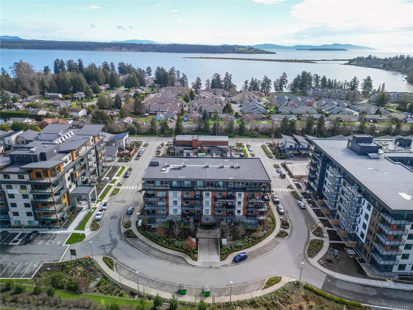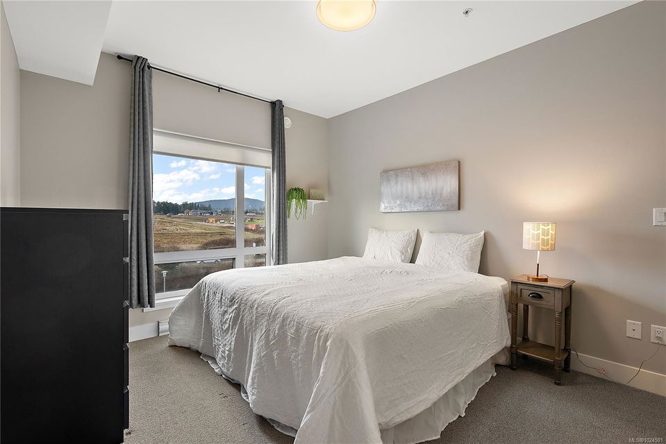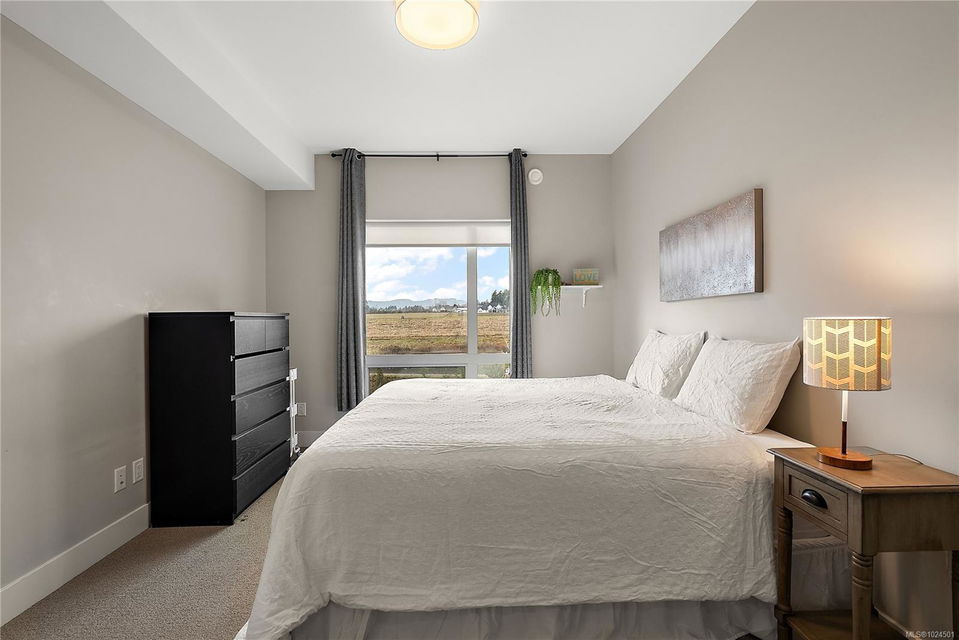 Welcome to The Arbutus—a like-new 2019-built 4th floor residence in Saanichton. This beautifully designed 2 bedroom, 2 bathroom home offers an excellent floor plan with ideal bedroom separation, each featuring walk-in closets and ensuite bathrooms. The primary ensuite boasts luxurious heated tile floors for year-round comfort. The open-concept living, dining, and kitchen area is enhanced by 9’ ceilings, triple-glazed soundproof windows, and a cozy natural gas fireplace. The chef-inspired kitchen includes stainless steel KitchenAid appliances, a gas range, quartz countertops, and ample storage—perfect for entertaining or everyday living. Additional features include in-suite laundry with gas dryer, secured underground parking with recently installed EV charging infrastructure, storage locker, bike storage, designated visitor parking and street parking with free city EV charging station outside. Pet friendly building allowing two dogs or two cats or one of each with no size restriction. Still covered by the 2-5-10 National Home Warranty. Ideally located in Central Saanich, just minutes to downtown Sidney, ferries, and the airport, with easy access to Victoria. Steps from popular Marigold Cafe and a convenient family clinic and pharmacy. Outdoor enthusiasts will love the nearby Lochside Trail, perfect for cycling and jogging. A fantastic opportunity to enjoy modern living in a prime location.