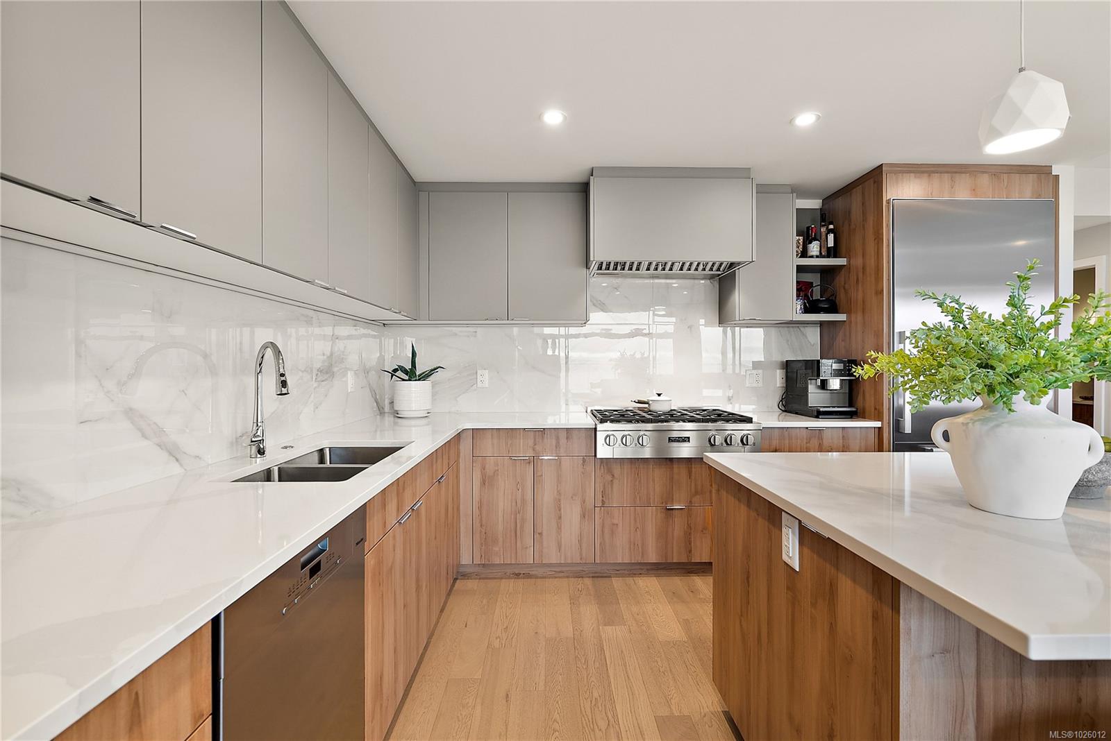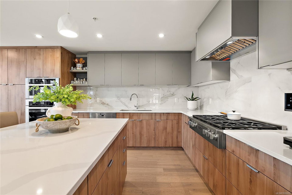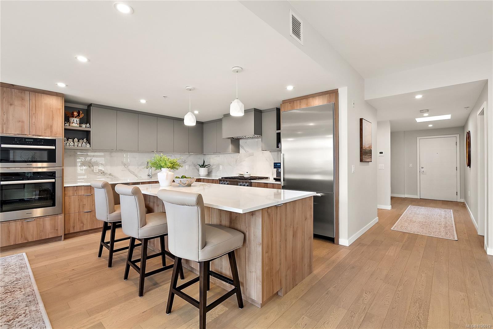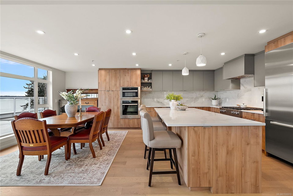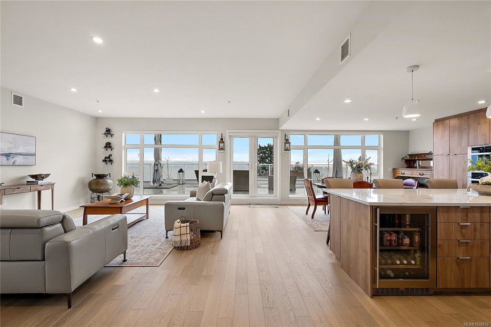 Experience refined living at the prestigious Haro in desirable Cordova Bay. This stunning residence offers breathtaking panoramic views and contemporary design at its finest. From the designer finishes to the chef-inspired kitchen and spa-like bathrooms, every detail reflects quality and sophistication. Warm light wood tones, natural veined tile, bright accents, and generous proportions create an inviting yet elegant atmosphere throughout. The gourmet kitchen is equipped with premium appliances and smart features, delivering exceptional style and performance for everyday living and entertaining. Step outside to the expansive 1,100 sq. ft. terrace and take in spectacular 270-degree views stretching from Cordova Bay’s sandy beaches to the snow-capped peaks of Mount Baker and beyond — a truly remarkable outdoor retreat. Enjoy close proximity to world-class golf, shopping, Mattick’s Farm, scenic hiking and biking trails, paddling, marinas, and more. Complete with two parking stalls, two storage lockers, and pet-friendly policies, this is a rare opportunity to own in one of the area’s most sought-after buildings.