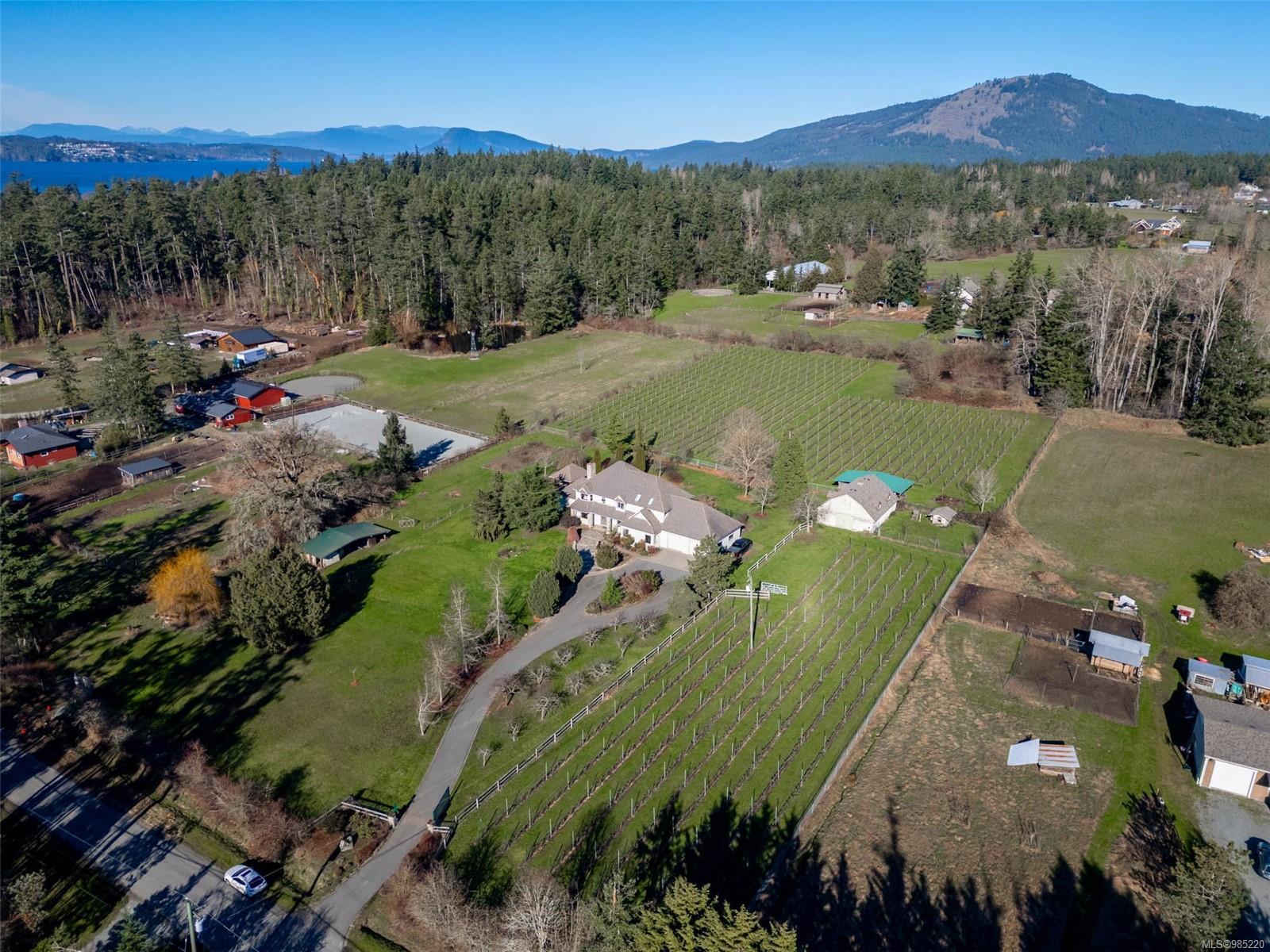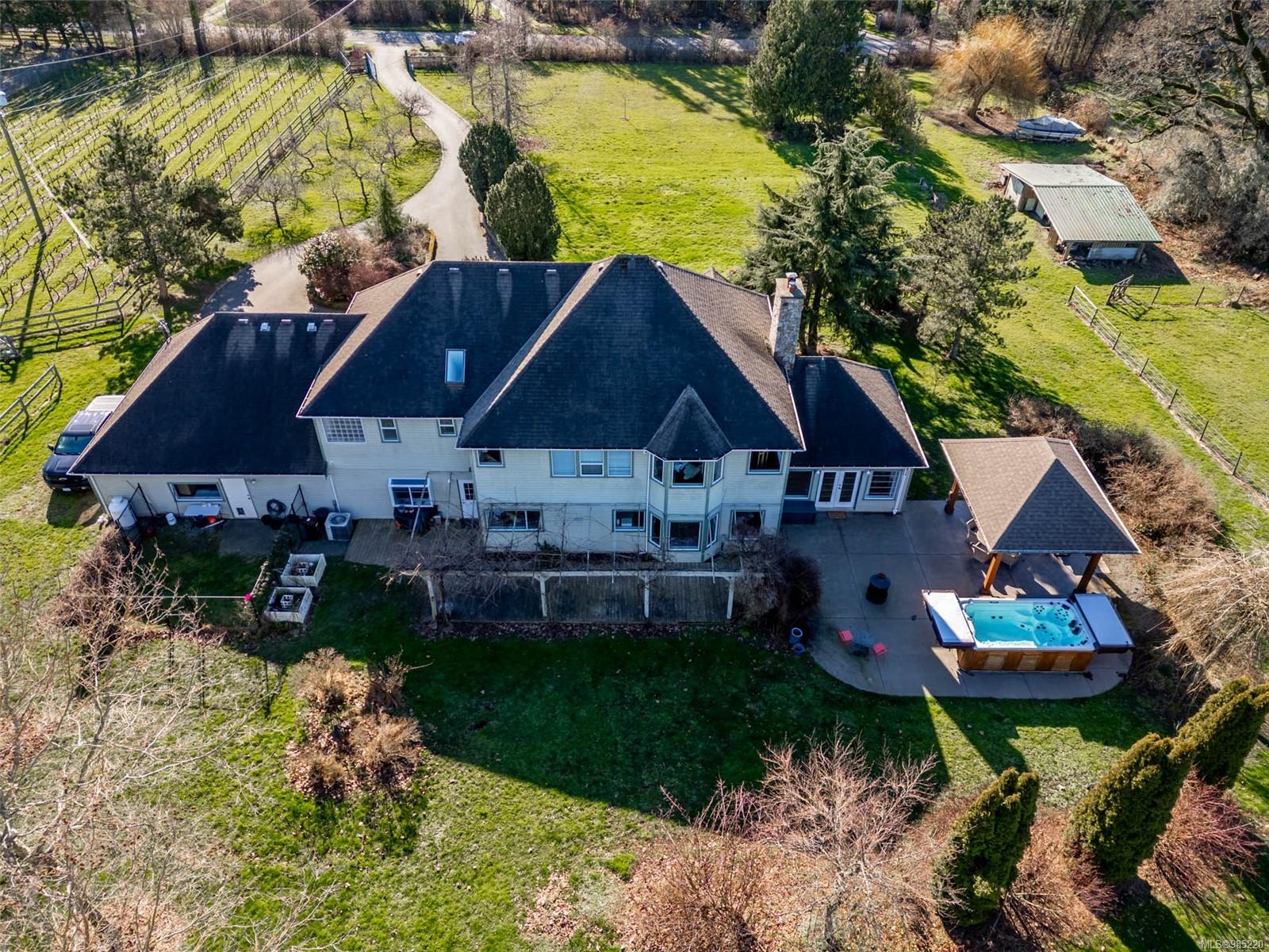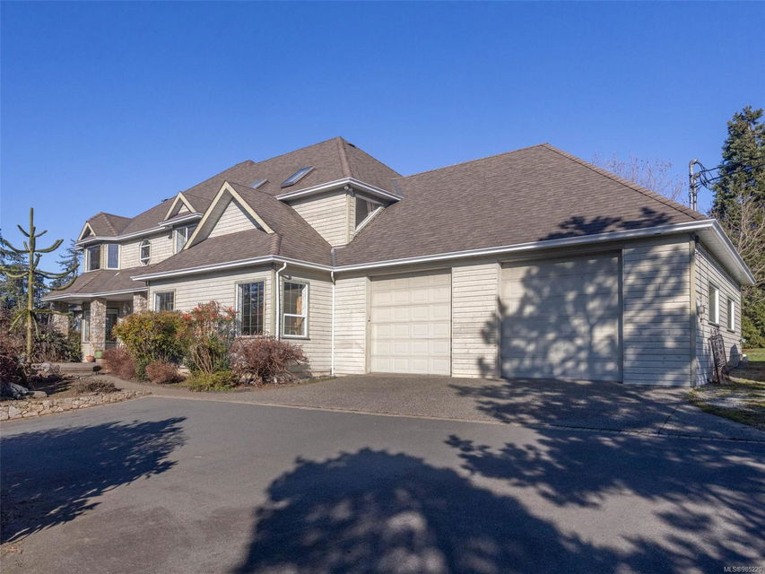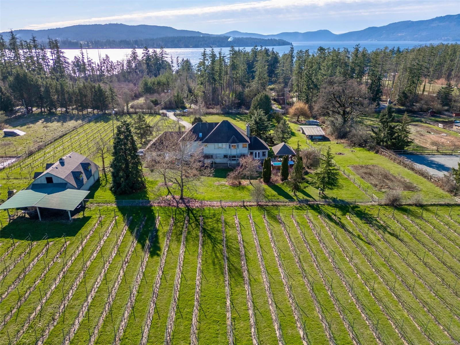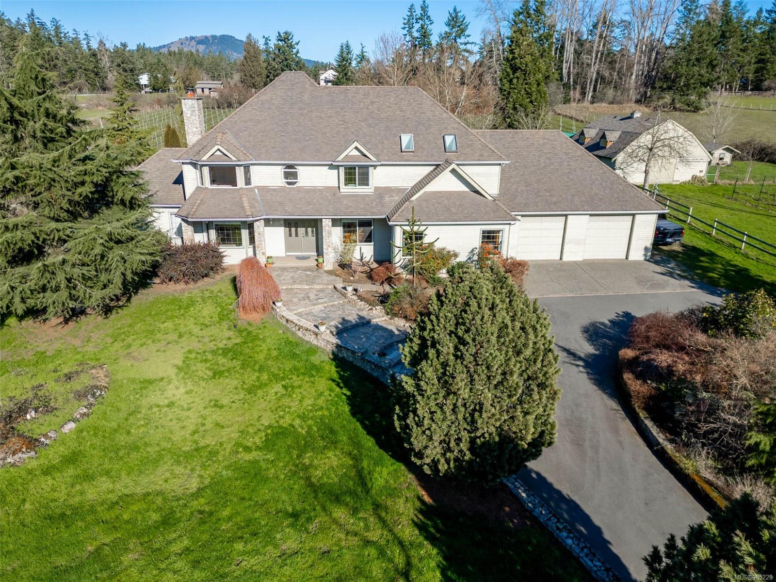 Nestled in the heart of the sought-after Saanich Peninsula, this enchanting 5-acre estate offers a rare opportunity to live in one of the area’s most premium growing regions. Bathed in sunlight, the south-facing fields boast gently sloping land, ideal for a flourishing vineyard and complemented by a charming orchard lining the private driveway. Step inside the meticulously crafted 4200+ sq ft family home and be welcomed by a spacious, sunlit kitchen equipped with top-of-the-line appliances and solid surface countertops. The main level flows effortlessly, featuring a formal dining room and a cozy living room with stunning views of the picturesque surroundings. A stone-surround fireplace anchors the family room, which opens onto a patio complete with a large gazebo and a relaxing swim spa—perfect for entertaining or unwinding in serene luxury. Upstairs, the primary suite is a tranquil retreat, while four additional bedrooms offer comfort and scenic vistas for family or guests. Outside, the versatile barn provides space for pets, hobbies, or farming ventures, enhancing the property’s endless possibilities. Whether you’re captivated by the art of winemaking or simply seeking a peaceful countryside escape, this exceptional property blends elegance and rural charm in a truly unique location. Embrace the lifestyle of your dreams—make this stunning estate your sanctuary today.